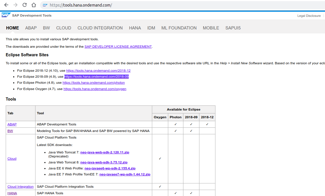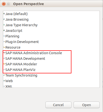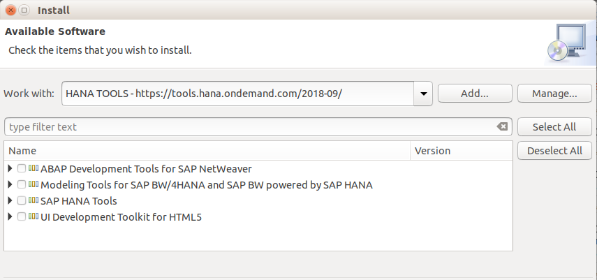 - After adding HANA tool repository, we can see list of all available HANA tools we can install on Eclipse.